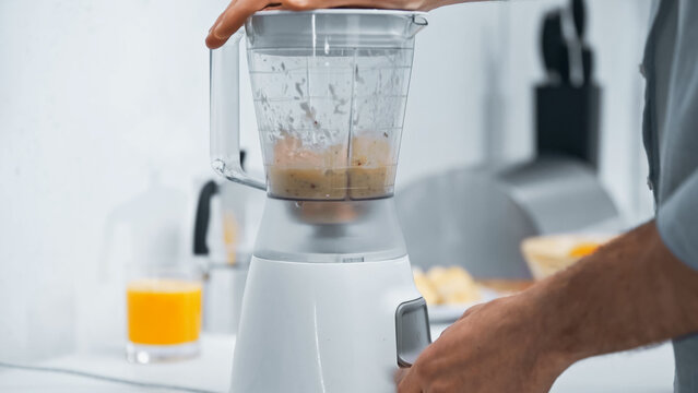 cropped view of man preparing smoothie in electric blender