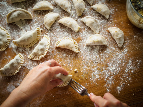 Homemade raw dumpling with potatoes. Preparation dumplings with mashed potatoes .