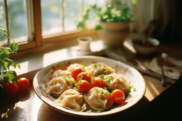 dumpling cut in half. Meat stuffing with herbs and spices inside the dumpling