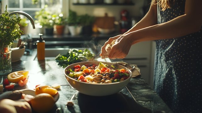 A kitchen countertop filled with ingredients for making a nutritious salad, featuring a variety of fresh fruits, nuts, grains, and greens, with a person in the background preparing the salad