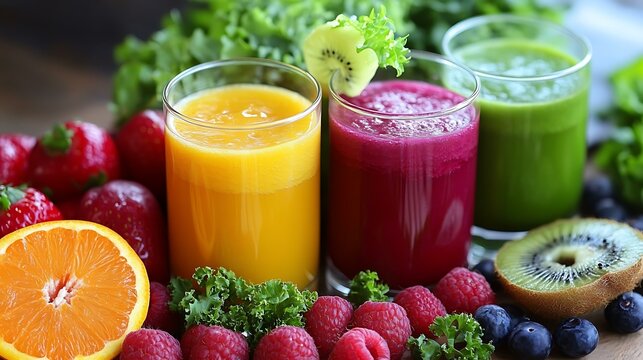 fruits and juice on wooden tabletop counter. in front of bright out of focus kitchen. copy space.