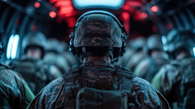 Back view of soldiers in combat gear sitting in a military aircraft, prepared for a mission jump. The atmosphere is tense with a focus on discipline and teamwork.
