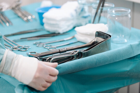 Surgeon in rubber gloves preparing surgical instruments on tray