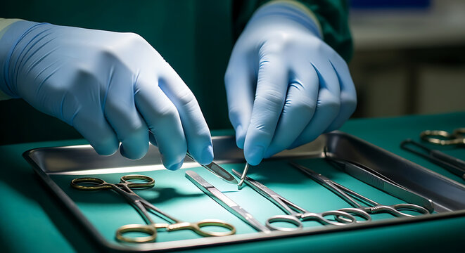 Surgical instruments arranged on a sterile operating table, with a gloved hand preparing tools for a procedure, showcasing the precision and care in a medical environment