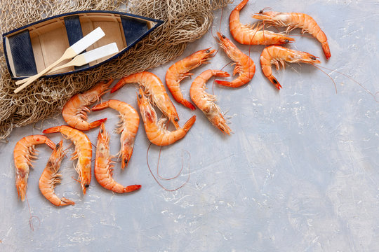 Fresh shrimps, fishing boat with oars and  fishnet. Top view, close up on light concrete background