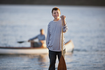 Smiling boy holding a wooden oar poses for a portrait in front of a man in a canoe floating in the water.
