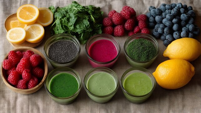 Ingredients for preparing various healthy smoothies and juices