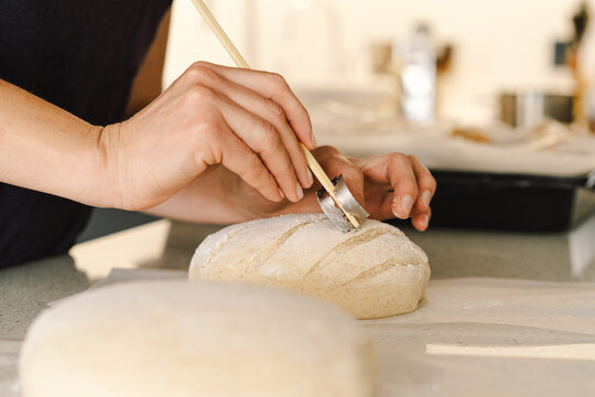 Woman hands skillfully score the surface of a round dough loaf, preparing sourdough bread for baking. The bright kitchen setting provides a warm atmosphere and fresh ingredients.