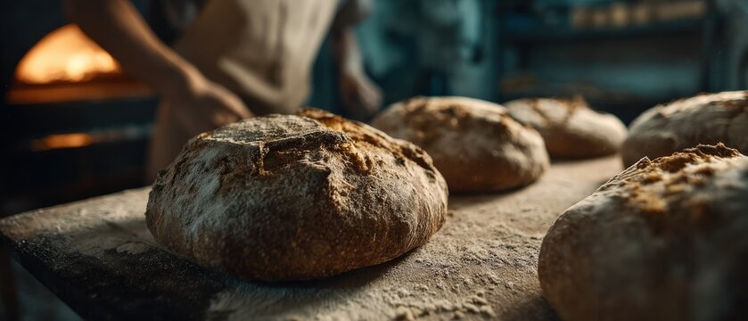 Baker preparing freshly baked sourdough bread loaves in a rustic bakery, showcasing artisan bread making and traditional baking techniques