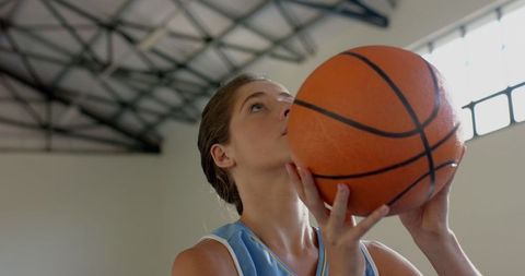 Focused female athlete preparing to shoot basketball indoors