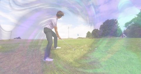 Golf swing precision with digital analytics overlay on green fairway