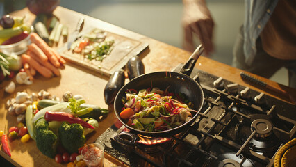 Chopping board, hands and man with vegetables, closeup and prepare a healthy meal at home. Zoom, male person and chef in a kitchen, vegan diet and nutrition with organic food, dinner and vegetarian