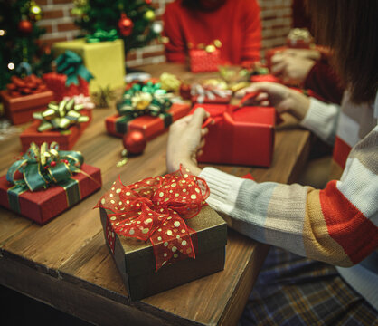 Hands exchanging Christmas gift box wrapped in brown paper with pine decoration and red white string, festive holiday season celebration with warm lights, friendship and happiness in home, New year