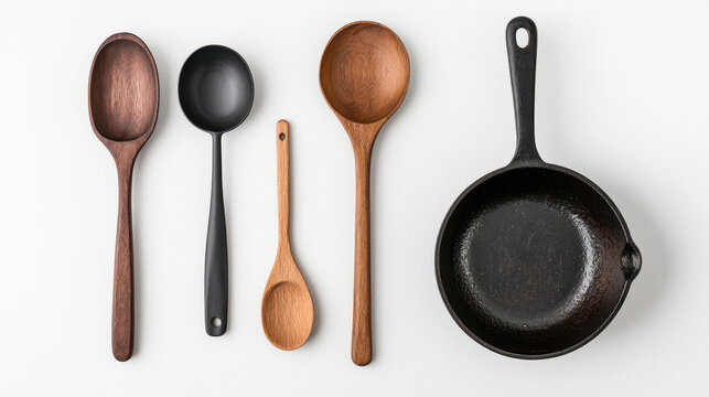 Wooden spoons cooking utensils kitchen tools cast iron skillet black spoon natural wood culinary equipment kitchenware food preparation modern