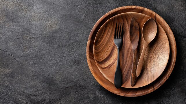 Utensils are arranged neatly on wooden plates resting on a dark surface. The setup looks ready for meal preparation displaying a fork and spoon alongside the plates.