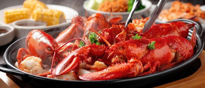 Close-up view of a lobster being cut with tongs in a pot while steam rises, showcasing a seafood meal preparation in a kitchen setting