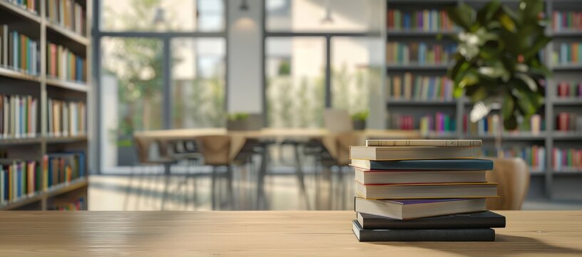 books stack on table in blurred background of library interior, education and back to school concept, copy space for product display presentation design