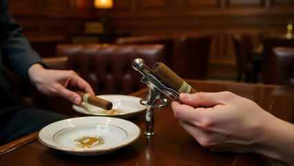 Luxury cigar preparation in an exclusive smoking lounge with high-end accessories.