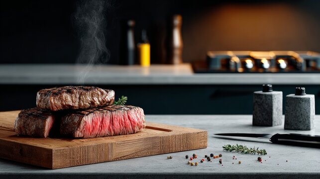 Bison steak thick-cut seared with coarse sea salt and cracked black pepper in cast iron skillet, premium restaurant presentation with fresh thyme garnish, gourmet meat dish preparation
