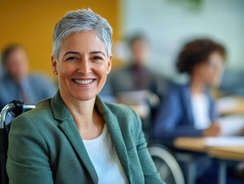 Confident businesswoman in wheelchair at inclusive meeting