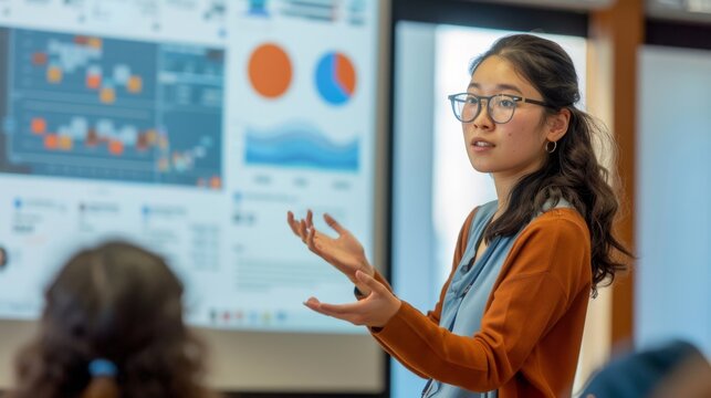 an Asian businesswoman presenting financial data on charts and graphs to her team in the conference room.