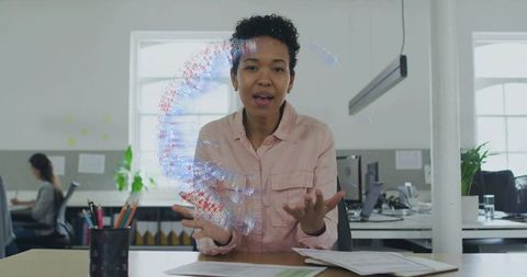 Presenting augmented reality globe, woman gesturing during modern open office meeting