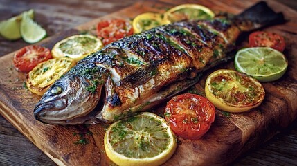Grilled whole fish seasoned with herbs, served with charred lemon, lime wedges, and cherry tomatoes, presenting a healthy and delicious seafood meal on a rustic wooden platter