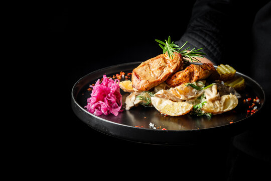 A beautifully presented plate featuring roasted chicken, garnished with fresh herbs, served alongside creamy potatoes and pickled vegetables, against a dark background