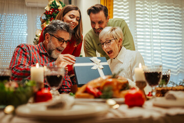 Family having christmas dinner together opening present