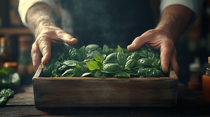 Chef presenting fresh basil in a rustic wooden box.