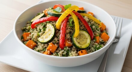 Vibrant multicolored vegetable grain salad is presented neatly in a white bowl on a light surface.