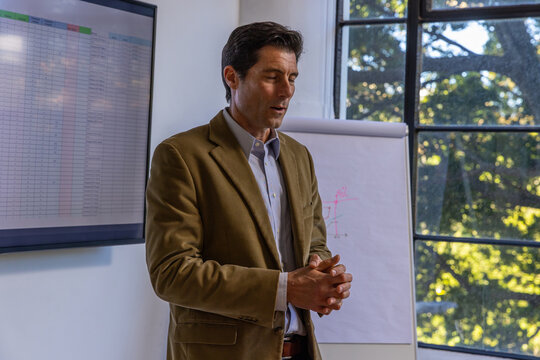 Adult male presenting spreadsheet on monitor in meeting room, pointing at flip chart diagrams