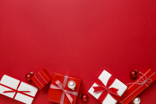 Christmas gifts presents on red background. Simple, classic red and white wrapped gift boxes with ribbon bows and festive holiday decorations. Horizontal bottom border.