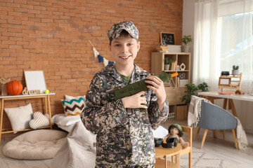 Young boy dressed as a soldier is aiming a toy gun while playing outside at sunset