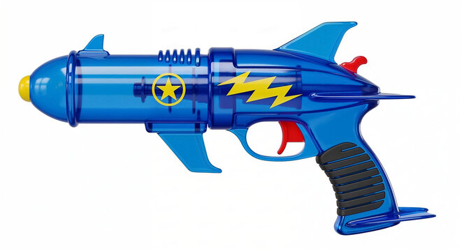 Blue toy ray gun with yellow star and lightning bolt emblazoned on side