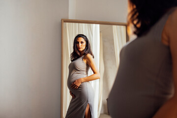 Close up of female portrait of beautiful pregnant in grey dress touching her belly. Reflection of young woman expecting baby in large rectangular mirror.
