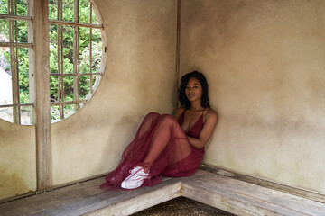 Beautiful black woman with braided long hair sitting in the floor