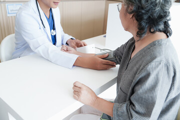 Doctor in white coat measuring blood pressure of elderly female patient during routine medical checkup in clinic, highlighting preventive healthcare and patient care.