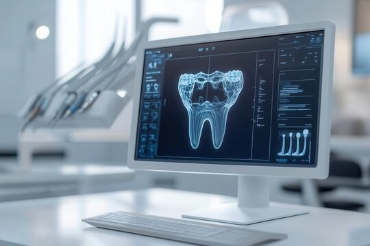 Virtual cosmetic dentistry assistant, AI-guided dental procedures, futuristic dental lab