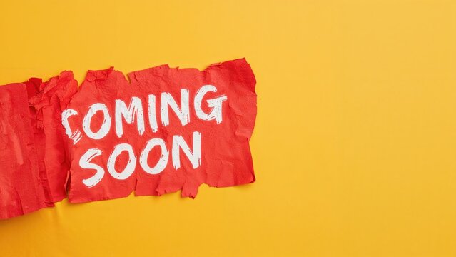 Red ribbon banner with white text COMINGSON on a light grey background Keywords: coming