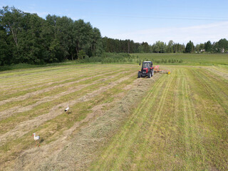 A small red tractor pulls a rotary rake, lining up the previously cut foliage. The drone shows an aerial image of the Estonian field in summer. two herons came to look for food behind the tractor.