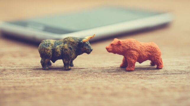 Stock market trends: bear and bull figures on financial document