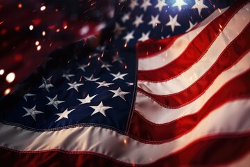 Fourth of July fireworks illuminate the night sky, featuring the vibrant red, white, and blue of the American flag with its iconic stars and stripes, symbolizing USA independence and patriotism