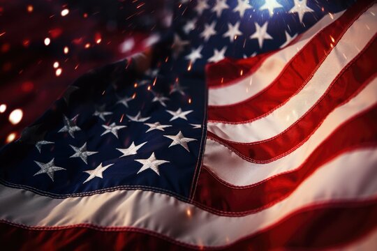 A close-up image of an American flag with vibrant fireworks in the background. Perfect for patriotic celebrations and events