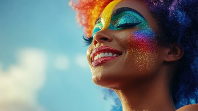 A vibrant drag queen shines in a rainbow wig and glitter makeup, embodying joy at a summer pride parade.