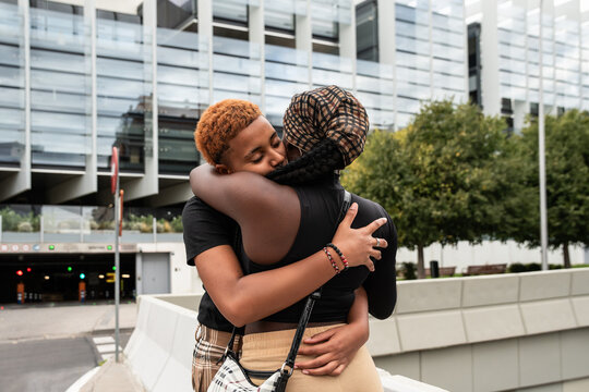 Romantic embrace of an LGBT multiethnic couple in the city environment