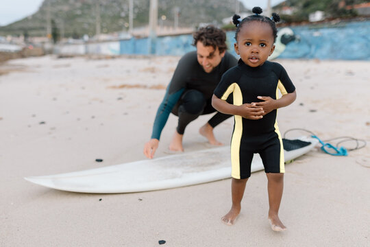 Black toddler in a wetsuit on the beach