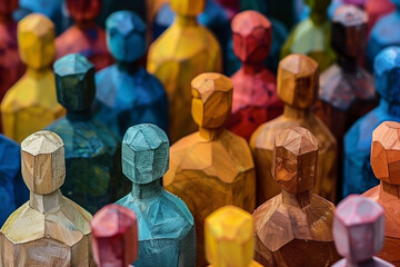 Colourful, bright and positive photo of human shaped rustic carvings, representation of cultural and physical diversity.