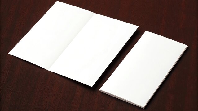 Blank folded brochure and a stack of paper on a dark wooden table