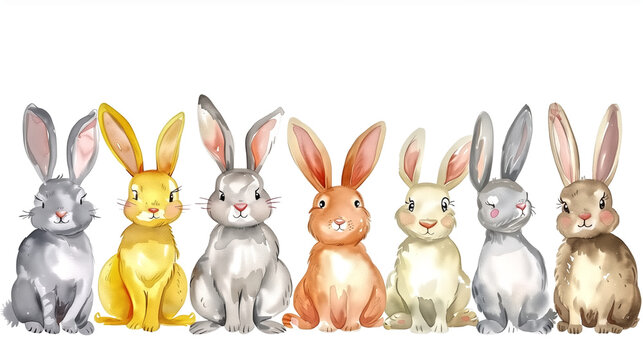 Group of cute cartoon bunnies on white background, watercolor st